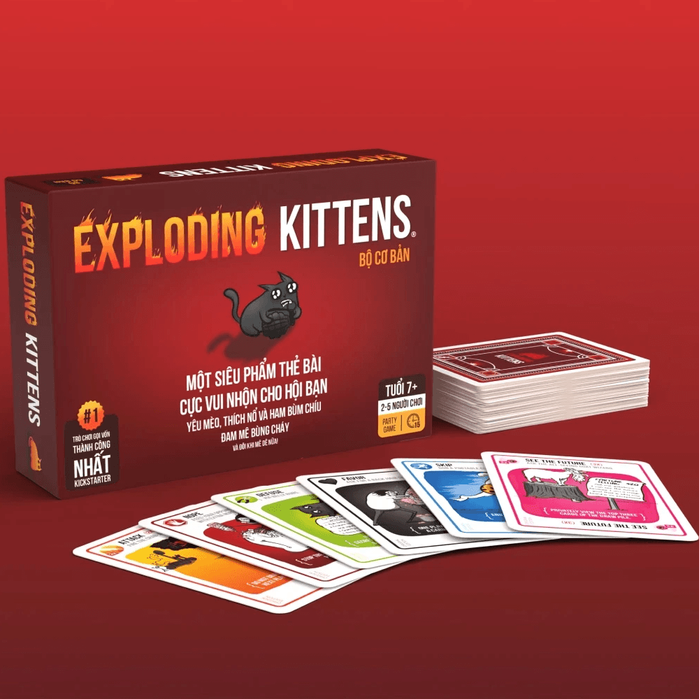 - Review: Trò chơi là một cuộc đấu trí đầy căng thẳng khi mỗi người chơi phải tìm mọi cách để không rút phải lá bài mèo nổ. Những lá bài chức năng như "nhìn trước tương lai" hay "tấn công" tạo nên sự biến hóa không ngừng cho ván đấu.